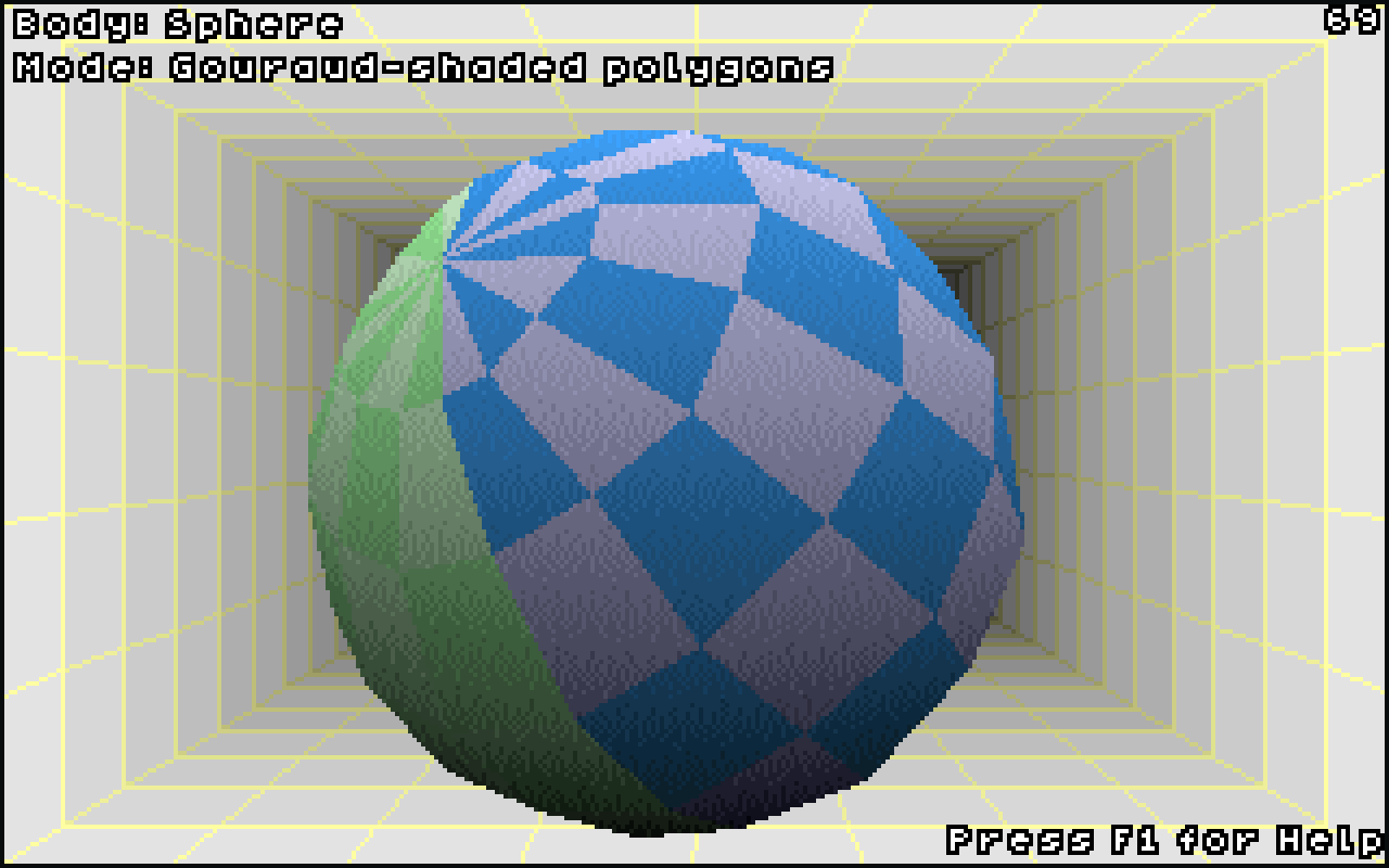 Despite what the demo says, I did not implement proper Gouraud shading, I just wrote a routine which draws surfaces of variable brightness, which is the basis of Gouraud shading, and I made this routine use dithering so as to overcome the limited palette constraint of the 256-color display. In order to do it properly I would have had to have a proper light source, and to compute the normal at each vertex, and then interpolate brightness values along each edge. Instead, I just used the Y coordinate of each scan line as a relative brightness value. The result is pretty cool, though it is a pity that I did not have the time to take it one step further and make it proper.