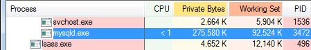 The following image shows the mind-boggling amount of memory occupied by MySQL 5.6 server on Windows 7 64-bit.