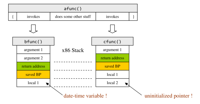 Function bfunc() had two arguments and one local variable . Function cfunc() had one argument and two local variables, of which the second was the uninitialized pointer. So, the uninitialized pointer in cfunc() shared the same stack word as the local variable in bfunc().