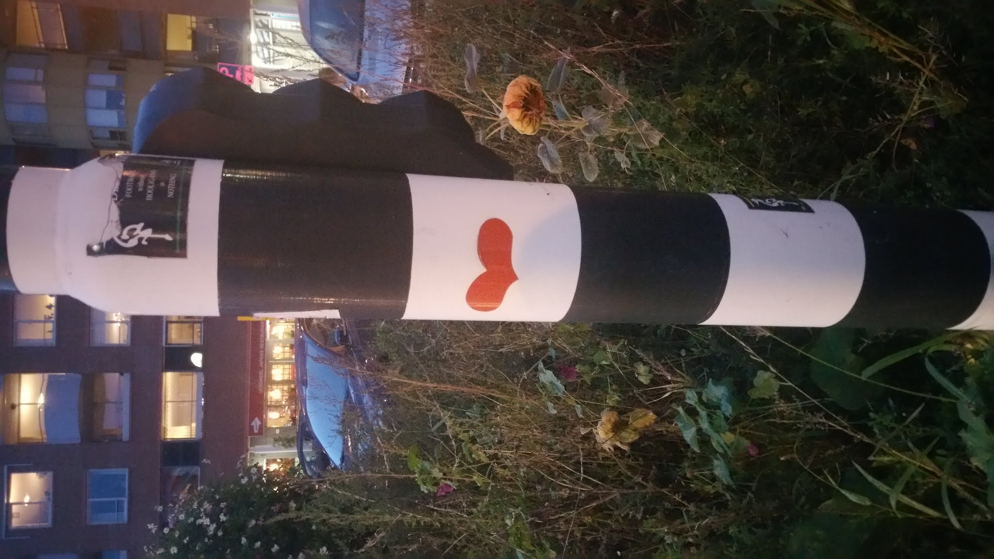 So, after a bit of research it seems that the heart had been placed on the traffic light post back in 2015, and then in 2016 the post was probably hit by a car and became slightly slanted, so today there is no heart sticker on it anymore, but it is standing straight again, so it has probably been replaced.