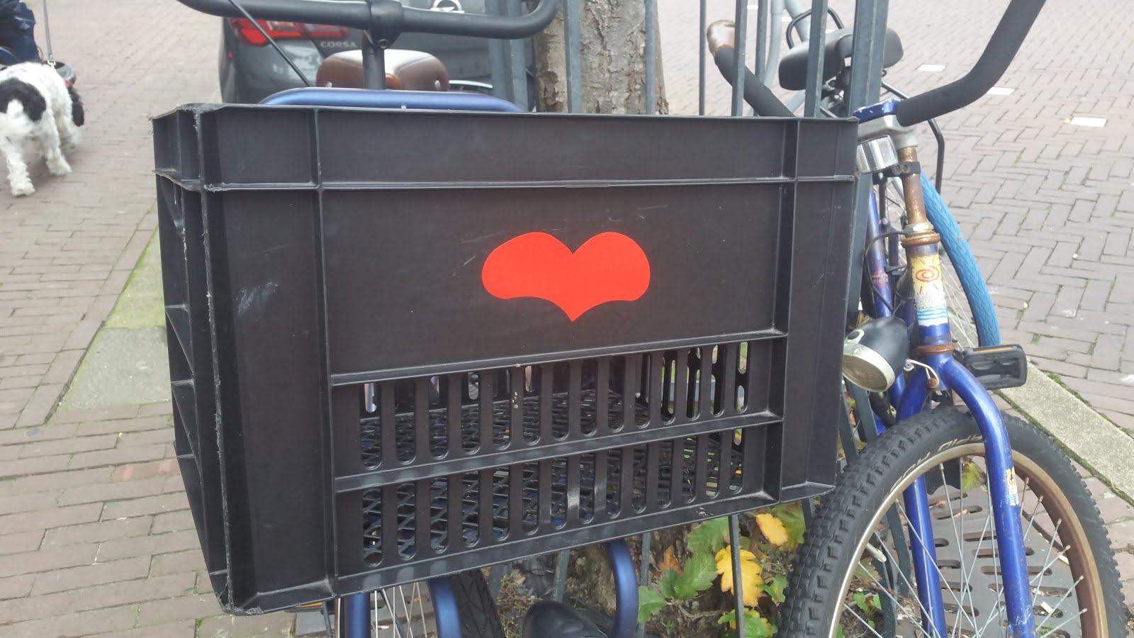 It may be difficult to see it in the picture, but there is a bicycle parked on the other side of the street, that has a box in front of the steering bar, and on that box there is a big red heart sticker!