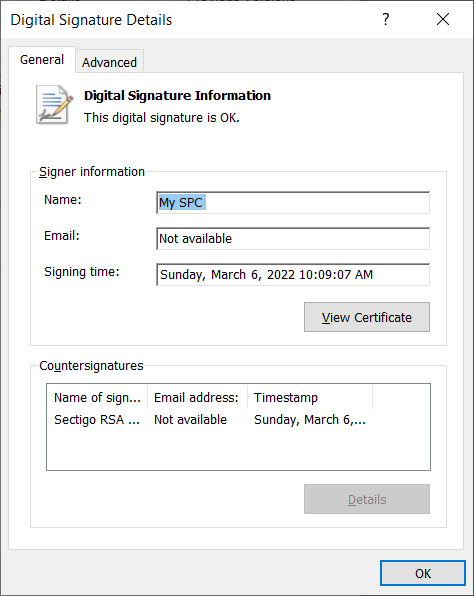 Of course, Windows is finding the digital signature to be "OK" only because I have installed this self-created and fictitious "My CA" Certification Authority. On a customer's computer it will most probably not show "OK" unless you purchase a certificate from a valid Certification Authority, but for the purpose of passing the silly virus checks on virustotal.com, it is okay.