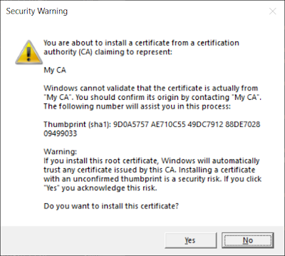 This will pop up a big dialog saying that it does not know where this certificate came from, and it cannot verify its authenticity, (of course, since we just created the Certification Authority out of thin air,) and asking us whether we are sure that we want to proceed installing it.