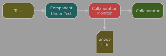 In order to observe how the component-under-test interacts with its collaborator, we interject between the two of them a new component, called a Collaboration Monitor, which is a decorator of T. The purpose of this Collaboration Monitor is to record into a text file information about each function call that passes through it. The text file is called a Snoop File, and it is a special form of test output file. (See Approval Testing.)