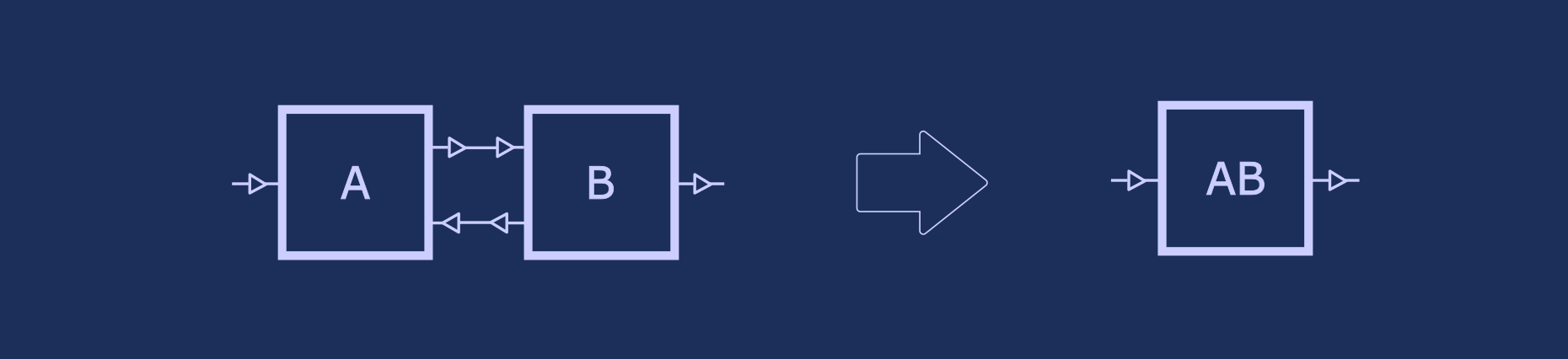 The presence of a call cycle between components A and B might indicate that perhaps they should not be separate components, and that we might be better off by fusing A and B into a single component. In doing so, we remove the cycle from the topology of the design by turning it into an implementation detail of the new component. The following figure illustrates this: