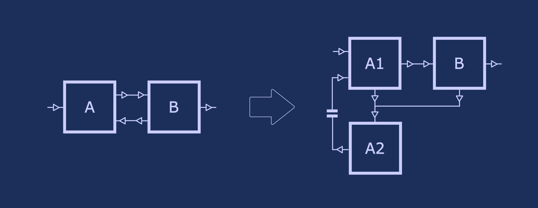 Note that the symbol for the air-gap component has been borrowed from electronics, where it stands for a capacitor. An electronic capacitor is also, in a sense, an air gap; however, the similarity is superficial, and it is only meant to serve as a mnemonic: In software, an air-gap pseudo-component does not maintain any charge, nor does it act as some kind of high-pass filter, etc.; it just allows us to pick a wire that takes part in a call cycle, and trivially make that wire break the cycle.